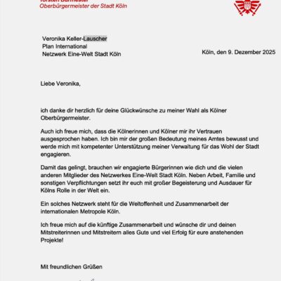 Screenshot Der neue Oberbürgermeister der Stadt Köln Torsten Burmester (SPD) sichert dem Netzwerk Eine-Welt Stadt Köln und damit unserer PLAN Aktionsgruppe Köln seine Zusammenarbeit in der Zukunft zu und wünscht uns viel Erfolg bei den Projekten.